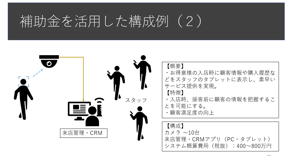 「小規模事業者持続化補助金」と「ものづくり・商業・サービス生産性向上促進補助金」を活用した当社のエッジAIカメラを適用の構成例を紹介します。