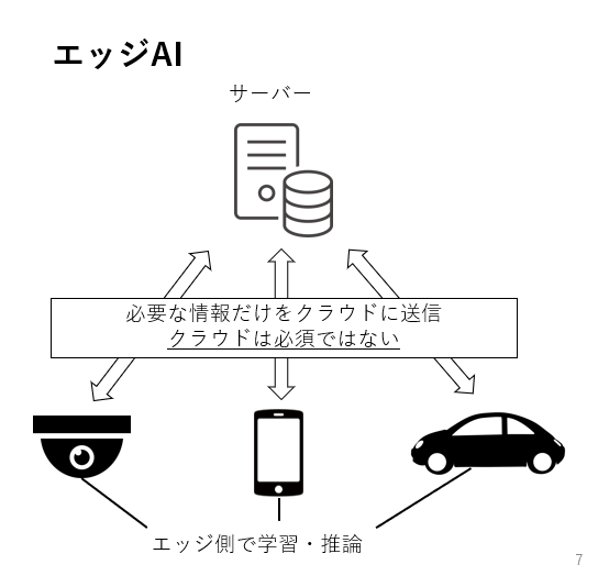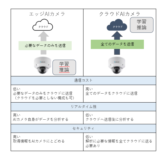 クラウドAIとエッジAIの2つのパターンがあります。即時性への対応には、クラウドAIは、クラウドに送られたのち分析するのに対し、エッジAIカメラ自身が行うため、エッジAI が有利です。