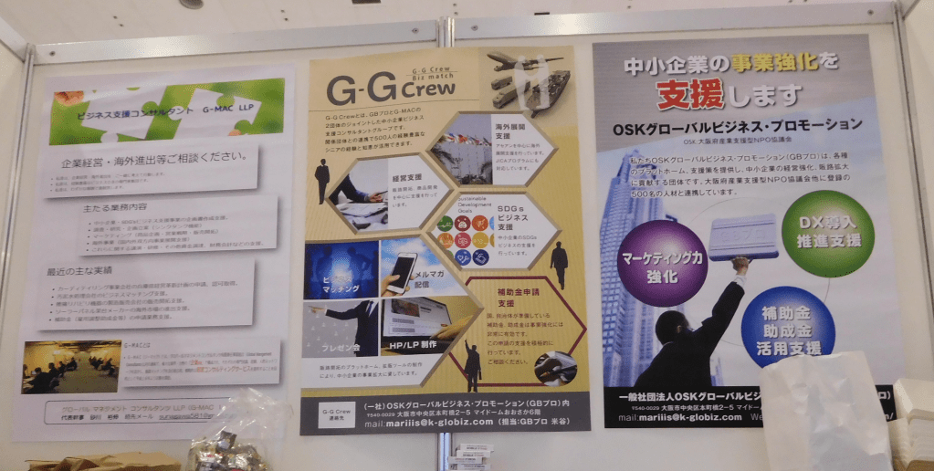 なお、ブースでは、GBプロ、G-MACが日常、支援・協業を行っている中小企業・団体のチラシを配布するともに、そのエッセンスを動画にまとめディスプレーで流しました。その動画を以下の通り紹介します。少し長いので、3パートに分けています。
